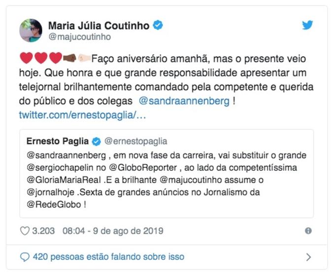 "Faço aniversário amanhã, mas o presente veio hoje. Que honra e que grande responsabilidade apresentar um telejornal brilhantemente comandado pela competente e querida do público e dos colegas Sandra Annenberg", escreveu Maju ao compartilhar um tuíte do jornalista Ernesto Paglia que falava sobre as novidades.