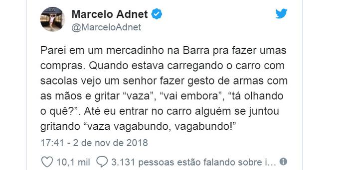 Adnet, que assumiu voto em Fernando Haddad, disse: "Parei em um mercadinho na Barra pra fazer umas compras. Quando estava carregando o carro com sacolas vejo um senhor fazer gesto de armas com as mãos e gritar “vaza”, “vai embora”, “tá olhando o quê?”. Até eu entrar no carro alguém se juntou gritando “vaza vagabundo, vagabundo!”, contou Adnet.