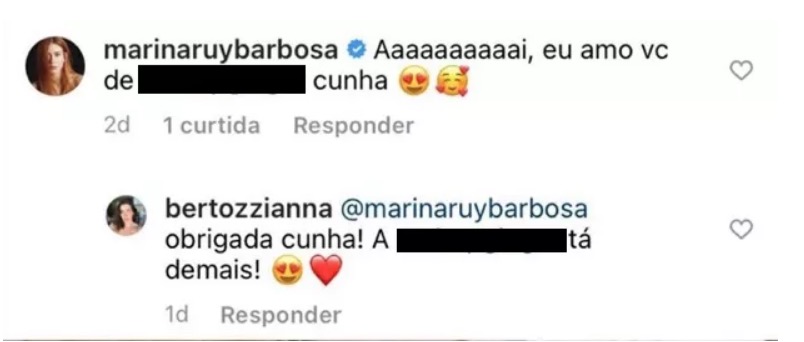 A atriz comentou em uma foto de Anna Bertozzi, casada com Marcelo Mussi, irmão do deputado. “Eu amo você de ShopGinger, cunha”, escreveu a ruiva se referindo a sua própria marca de roupas.