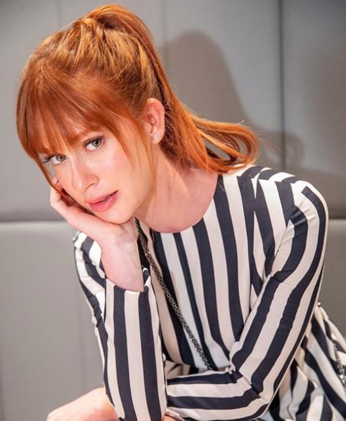 Esbanjando elegância, a atriz mostrou a franjinha e prendeu em um rabo-de-cabelo os cabelos que foram tonalizados em um tom mais intenso de ruivo.