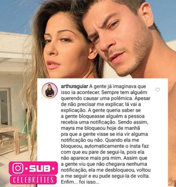 “A gente já imaginava que isso ia acontecer. Sempre tem alguém querendo causar uma polêmica. Apesar de não precisar me explicar, lá vai uma explicação. A gente queria saber se a gente bloqueasse alguém a pessoa recebia notificação. Sendo assim, Mayra me bloqueou hoje de manhã pra que a gente visse se iria vir alguma notificação ou não. Quando ela me bloqueou, automaticamente o insta faz com que eu pare de segui-la. Assim que a gente viu que não chegava nenhuma notificação, ela me desbloqueou, voltou a me seguir e eu pude segui-la de volta. Enfim… foi isso.”, esclareceu o ator.