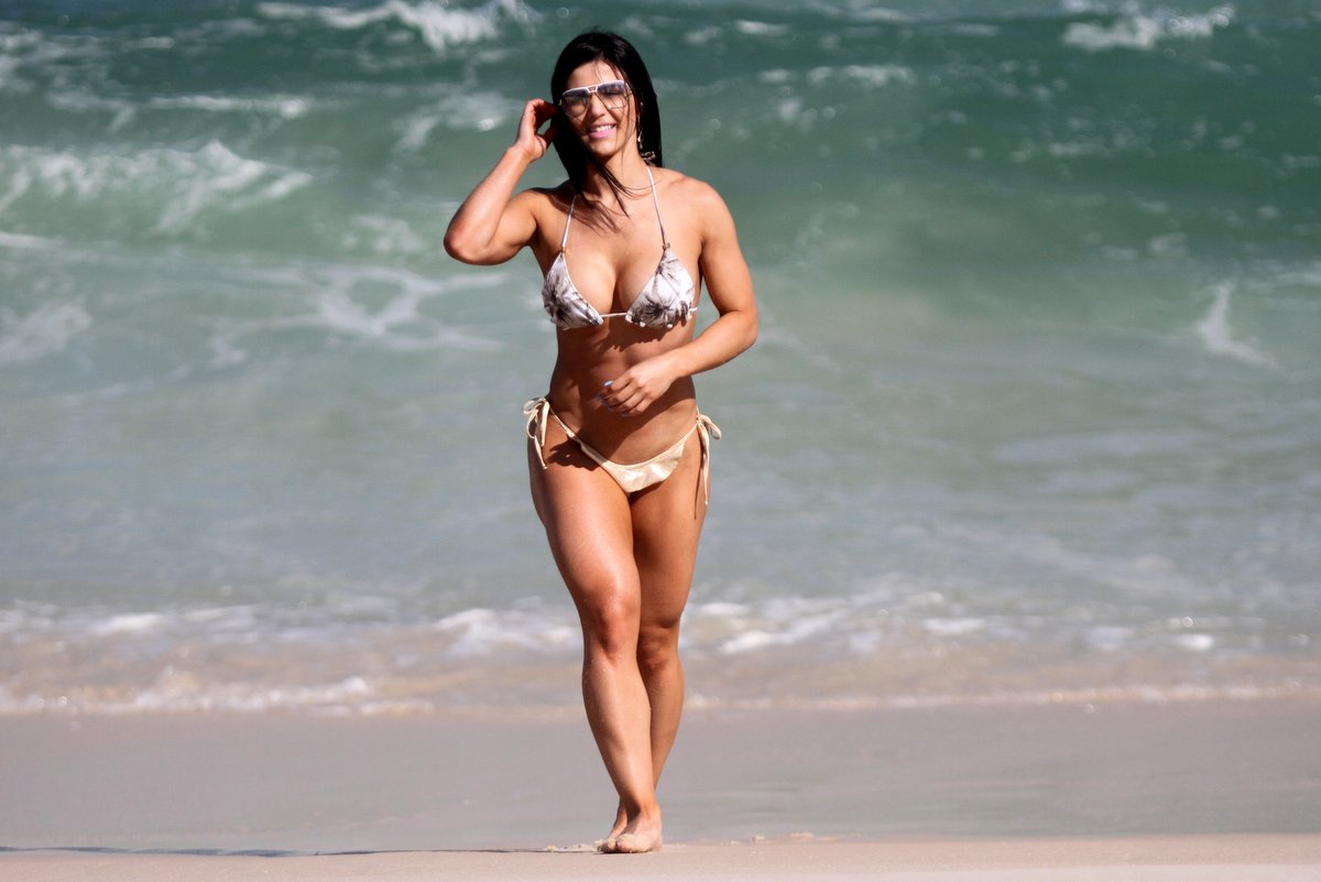 Eva Andressa mostrou porque é considerada a 'Musa Fitness' durante um dia de praia na Barra da Tijuca, no Rio de Janeiro. Cheia de músculos, a morenaça que já foi capa da 'Sexy' usou um biquíni fio-dental e causou inveja na mulherada.