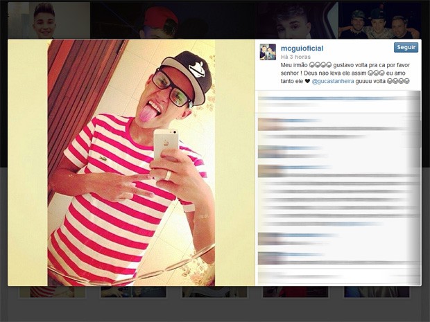 Logo em seguida, MC Gui postou outra foto dele, com a mensagem: "Meu irmão. Gustavo, volta pra cá, por favor, Senhor! Deus, não leva ele assim. Eu amo tanto ele. Guuuu volta".