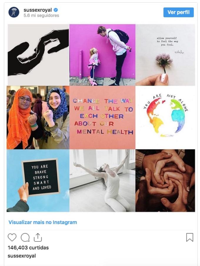 Neste mês, são 16 contas seguidas pelo Sussex Royal que trabalham com conscientização da saúde mental. A cada mês, eles mudarão as contas para atrair atenção a outras causas importantes.