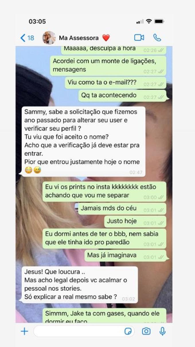 Nos stories a influecer postou uma conversa que teve com sua assessora, onde conta que havia pedido a alteração ano passado antes do hipnólogo entrar no reality.