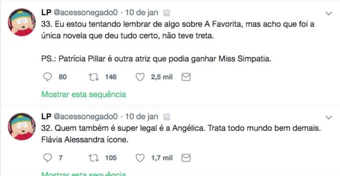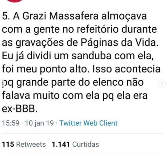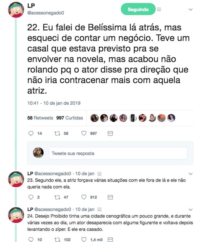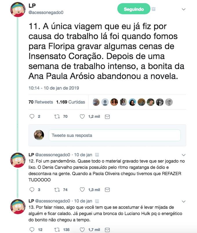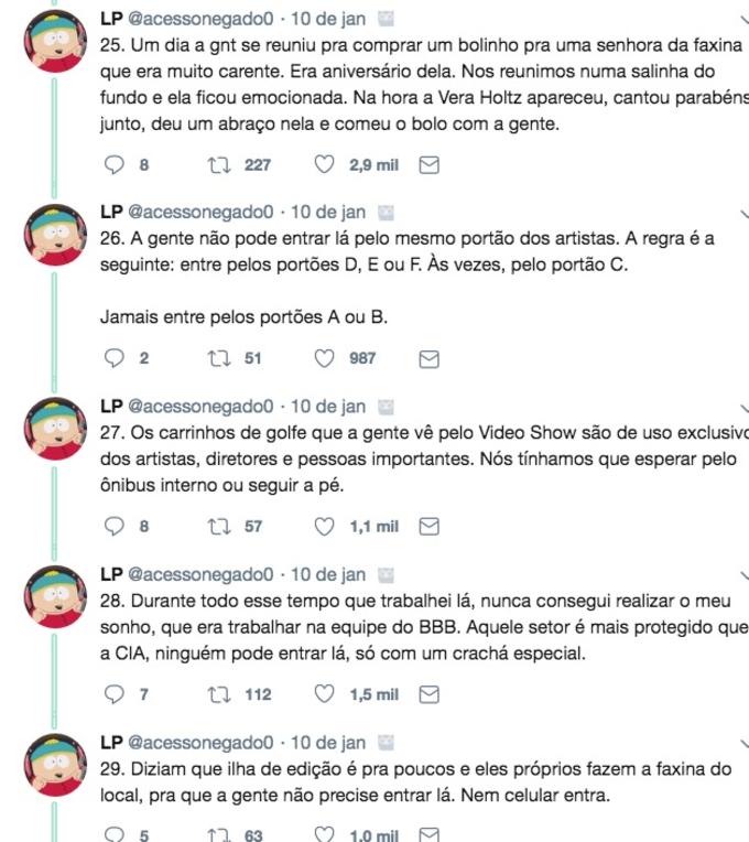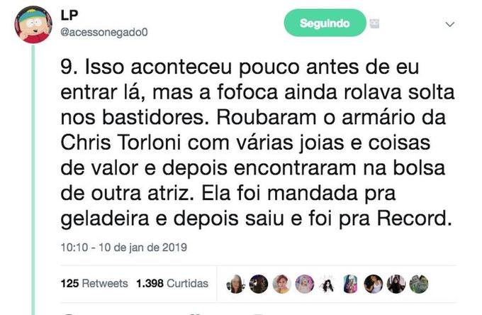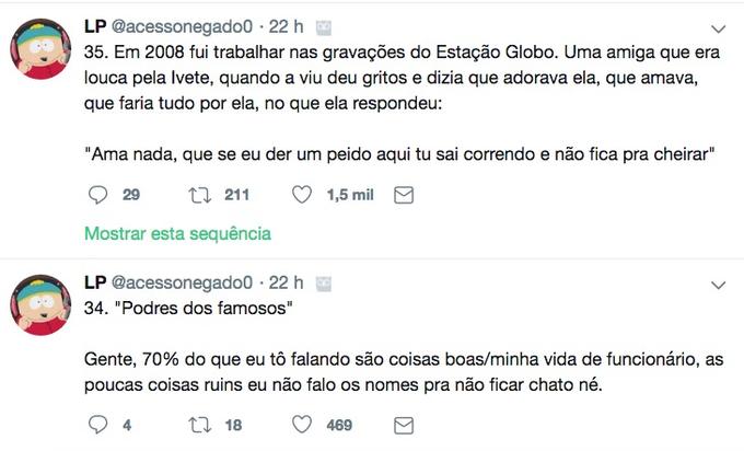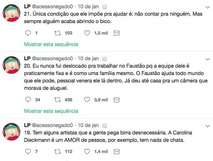 Nos tuítes, ele diz quais são os famosos que são "gente boa" e os que são mal educados com os funcionários, conta ainda que Faustão trata os funcionários como família e já chegou a dar uma casa para um deles, e revela que Christiane Torloni já foi roubada por outra atriz, que acabou indo para a geladeira da Globo e posteriormente para a Record, depois do bafafá.