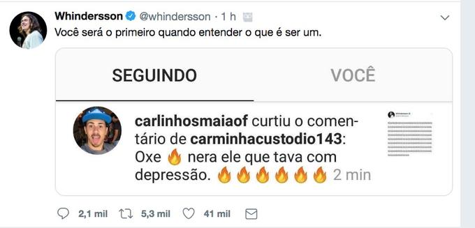 No Twitter, Whindersson (que anda um pouco afastado das redes para tratar de uma depressão) debochou, aparentemente da entrevista, com uma risada: "kkkkkk". Em seguida, Carlinhos curtiu uma mensagem desdenhando da depressão do então 'amigo'.
