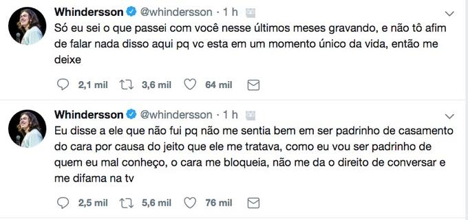 E Whindersson respondeu diretamente, marcando o influencer na mensagem: "Então me desbloqueia do zap bb. É só vc clicar no botão que bloqueia o celular e ir curtir, e não ficar falando besteira na tv. Não venha querer reverter na rede social não, vem brincar com meu problema, curta sua lua de mel e deixe eu em paz".