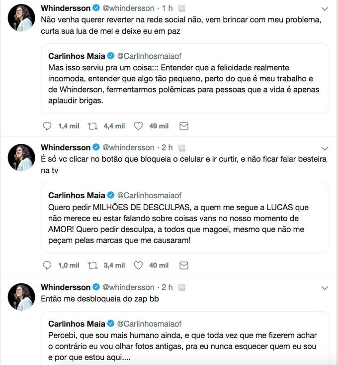 Em tweets nesta tarde, Carlinhos disse: "Percebi, que sou mais humano ainda, e que toda vez que me fizerem achar o contrário eu vou olhar fotos antigas, pra eu nunca esquecer quem eu sou e por que estou aqui....". e " Quero pedir MILHÕES DE DESCULPAS, a quem me segue a LUCAS que não merece eu estar falando sobre coisas vans no nosso momento de AMOR! Quero pedir desculpa, a todos que magoei, mesmo que não me peçam pelas marcas que me causaram! Mas isso serviu pra um coisa::: Entender que a felicidade realmente incomoda, entender que algo tão pequeno, perto do que é meu trabalho e de Whinderson, fermentarmos polêmicas para pessoas que a vida é apenas aplaudir brigas".