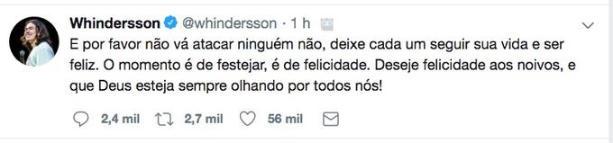 Por fim, Whindersson pediu: "E por favor não vá atacar ninguém não, deixe cada um seguir sua vida e ser feliz. O momento é de festejar, é de felicidade. Deseje felicidade aos noivos, e que Deus esteja sempre olhando por todos nós!".
