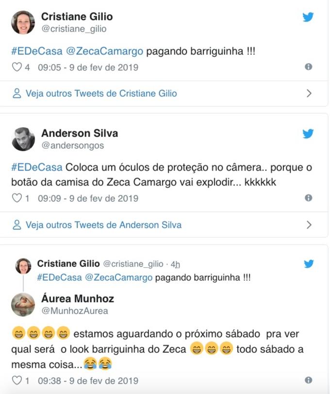 Com parte da barriga saliente à mostra, Zeca acabou dando o que falar nas redes sociais. “Camisa do Zeca Camargo quer se libertar! Kkkkkk”, brincou um internauta. “A blusa do Zeca Camargo está igual aquela alça do sutiã da amizade inseparável. Fazendo força para ficar junto”, escreveu outro.