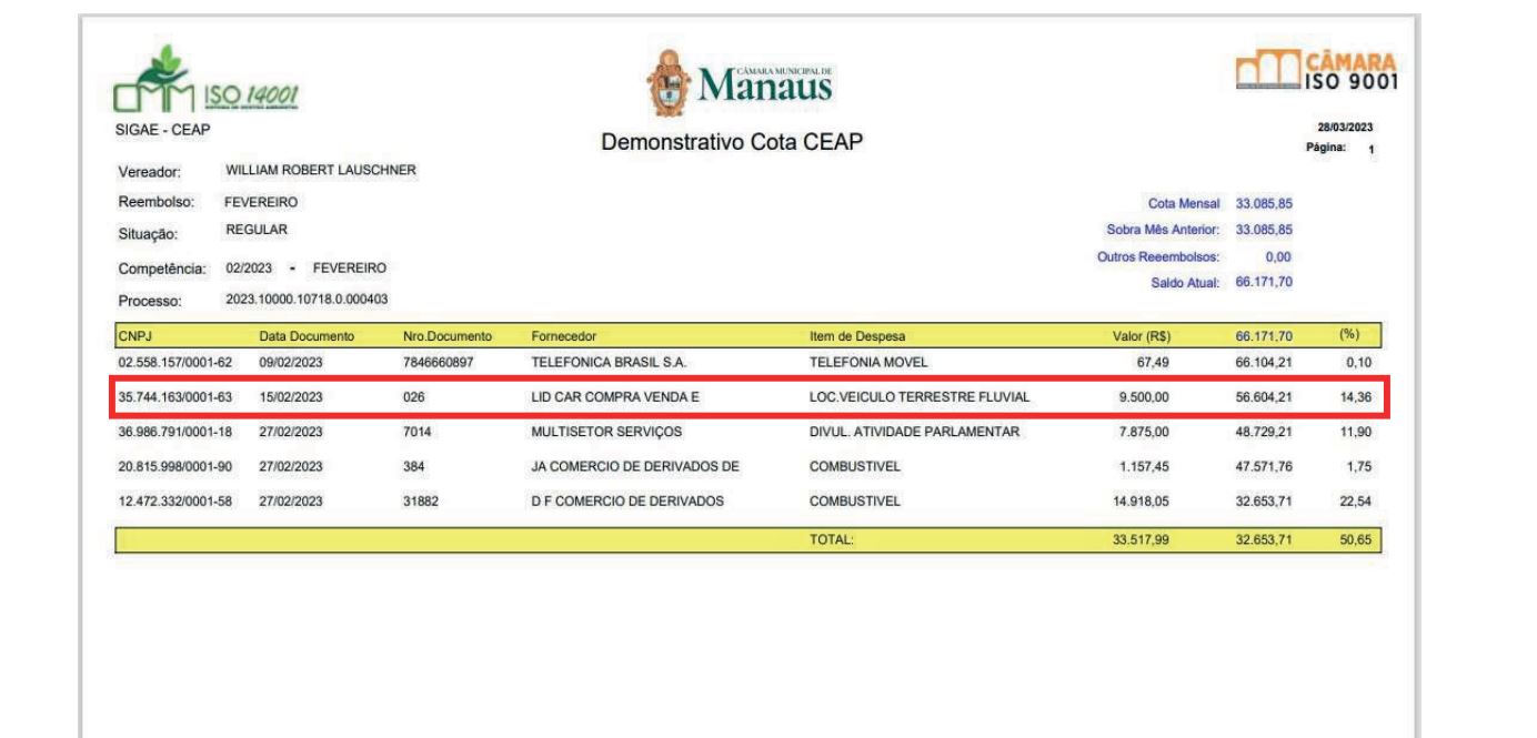 Documentos que constam no site da Câmara Municipal de Manaus, a locadora, identificada como LID Car Compra e Venda, recebe o valor mensal de R$ 9,5 mil pelo serviço.