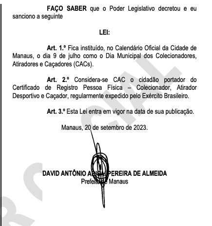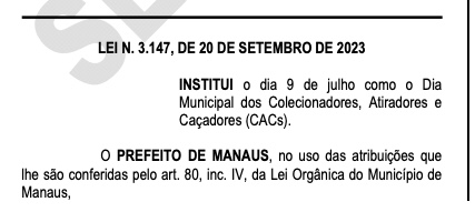 No texto do projeto, o vereador autor destaca que a proposta tem apenas o objetivo de reconhecer o dia 9 de julho como dia dos CACs em Manaus, sem infringir a lei federal nº 10.826/2003 que rege sobre o porte de arma para integrantes do desporto.