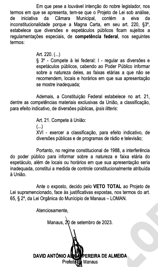 O Veto Total do projeto foi publicado no Diário Oficial do Município de quarta-feira (20). O texto especifica ser “louvável” o projeto apresentado pelo vereador Raiff Matos (DC), aprovado na Câmara Municipal de Manaus (CMM), mas ela é considerada ilegal por conta de ser competência federal determinar regras sobre eventos no país.