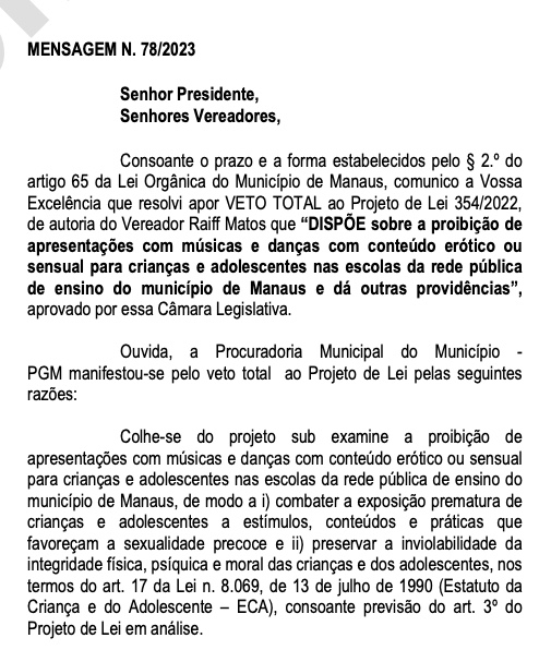 Manaus/AM - O prefeito David Almeida (Avante) vetou o projeto de lei que tinha objetivo de proibir apresentações com músicas e danças com conteúdo erótico ou sensual para crianças e adolescentes em escolas da rede pública municipal de Manaus. De acordo com o veto, a proposta é inconstitucional.