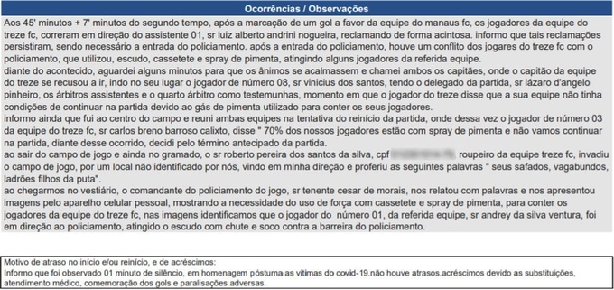 Na súmula do jogo entre o Manaus e o Treze-PB, relatada pelo árbitro Ilbert Estevam da Silva, que apitou o empate em 1 a 1 entre os times, ontem, na Arena da Amazônia, pode se ver a confusão generalizada que envolveu o jogo, que ocorreu pela sexta rodada da Série C do Brasileiro,