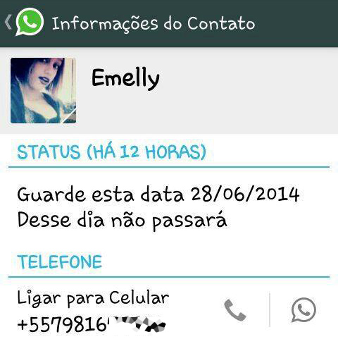 Testemunhas disseram que quatro horas antes da fatalidade, Emilly havia colocado a seguinte frase no status do seu WhatsApp: "Guarde essa data 28/06/2014. Desse dia não passará".