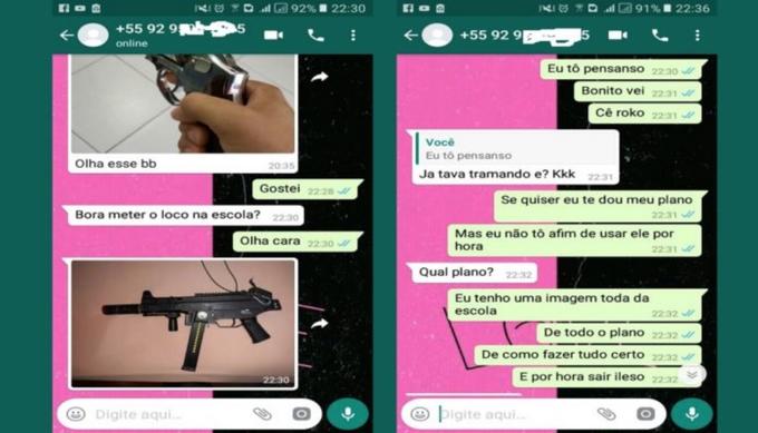 As mensagens que circulam mostram dois alunos que seriam finalistas do ensino médio, falando sobre um suposto plano de massacre que queriam por em prática no local. Em certa parte da conversa, um deles chega a dizer que tem um mapa da escola.