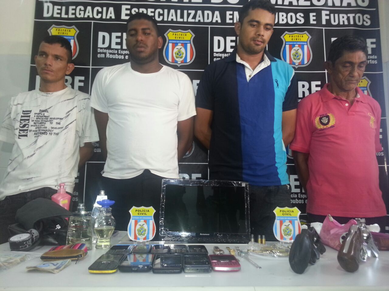 MANAUS - Sete bandidos envolvidos no assalto ocorrido neste domingo no Colégio Preciosíssimo Sangue foram apresentados pela polícia nesta segunda-feira (20) na Delegacia Especializada em Roubos, Furtos e Defraudações (DERFD). Eles também foram confirmados como autores dos assaltos na casa de um vereador e do proprietário da Casa do Eletricista.