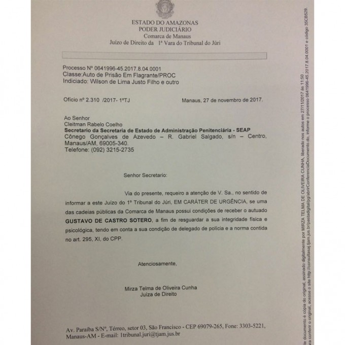 No documento enviado a Seap nesta segunda(27), a juíza Mirza Telma de Oliveira Cunha questiona se algum dos presídios teria condições de receber Soterro resguardando a sua integridade física e psicológica. O delegado está preso desde sábado(25) na carceragem da Delegacia Geral.