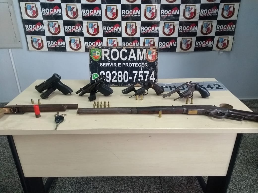 Ainda de acordo com a SSP, a Rocam apreendeu com o grupo um Toyota Etios utilizado na chacina, com placa adulterada e restrição de roubo, uma pistola .40, de treino da Polícia Militar do Pará, uma pistola 380, dois revólveres 38, uma arma caseira calibre 12 e um rifle .44. Todas as armas estavam com o número de série raspado. Também foram apreendidas munições.