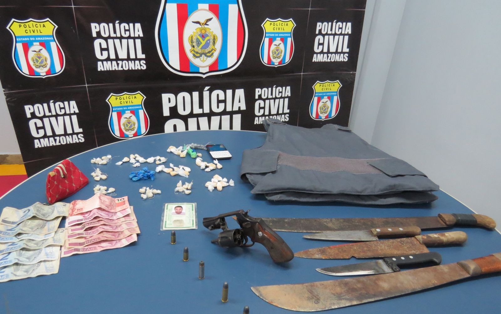 Sidney Feitosa Barreto, conhecido como “Rato”, foi preso na rua Santa Helena. Na residência dele, os policiais encontraram 60 trouxinhas de substância entorpecente com aspecto de pasta base de cocaína, cinco facões e R$ 52 em espécie.