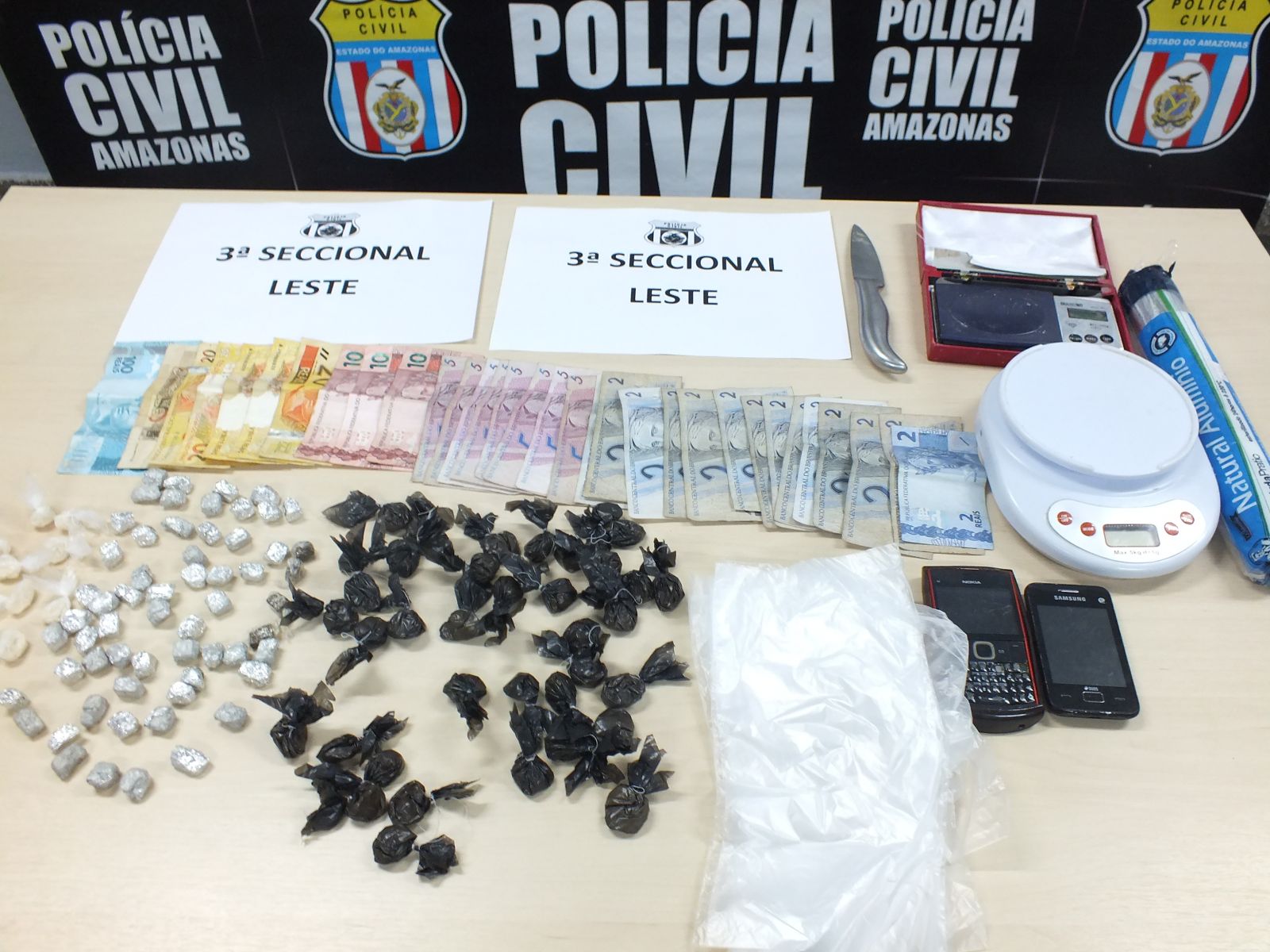 No local foram apreendidas 60 porções de maconha, 47 porções de pasta base de cocaína, duas balanças de precisão, R$ 338 em espécie, celulares e materiais para embalo da droga. Em depoimento, Robson declarou que os entorpecentes pertenciam a ele e que a tia, Francinete, não tinha envolvimento no crime.