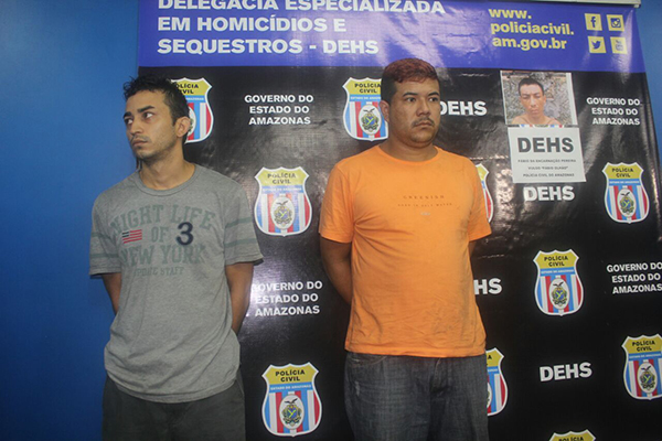 O titular da Delegacia Especializada em Homicídios e Sequestros (DEHS), delegado Ivo Martins, e a delegada adjunta Aline Lima, apresentaram nesta sexta-feira, 13, os presos Janderson Gonçalves, conhecido como “Buda” - na foto acima com investigadores da DEHS -, que foi preso em Manacapuru, e André Pinto Santiago, 29. Os dois são apontados como autores do duplo homicídio de Ítalo Jordão da Silva e Karl do Nascimento Nogueira, ocorrido no dia 3 de dezembro de 2014. O crime ocorreu na rua 3, Comunidade Santa Cruz, bairro Flores, zona Centro-Sul.