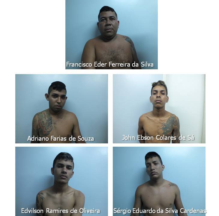 A Polícia Civil do Amazonas, por meio da equipe de investigação do 25º Distrito Integrado de Polícia, sob a coordenação do Delegado Titular, Adriano Félix, prendeu no início da noite de quarta-feira, por volta das 18h, Adriano Farias de Souza, 20, Edvilson Ramires de Oliveira, 20, Francisco Eder Ferreira da Silva, 28, conhecido como “Botinho”, John Ebson Colares de Sá, 18, e Sérgio Eduardo da Silva Cardenas Júnior, 20, o “Júnior Cuia”, após denúncias de populares.