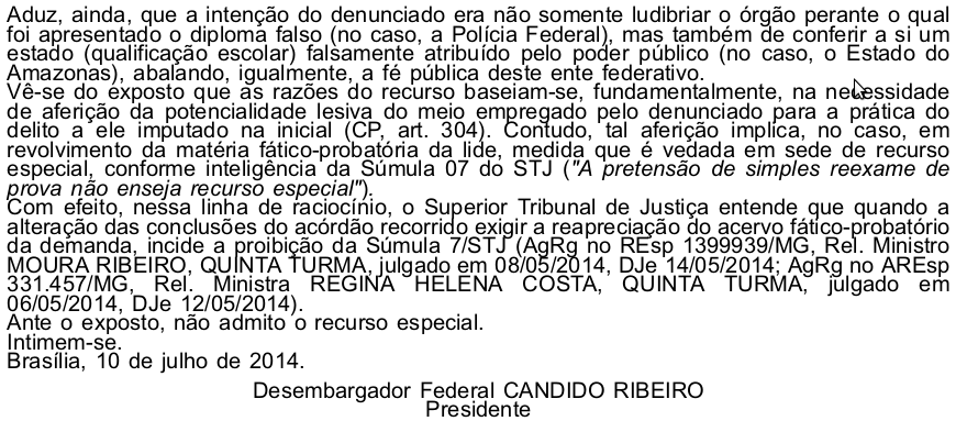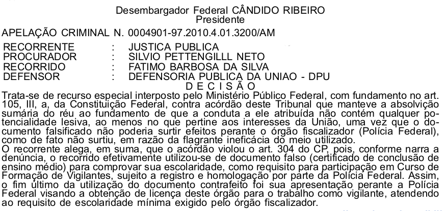 O desembargador federal Cândido Ribeiro negou recurso especial do Ministério Público contra decisão de juiz de primeiro grau que absolveu Fátimo da Silva da acusação de apresentar, junto à Superintendência da Polícia Federal no Amazonas, certificado de conclusão do ensino médio falso, para participar do concurso de vigilante. O Juiz de primeiro grau entendeu que a conduta do réu não continha qualquer potencialidade lesiva. Veja a decisão