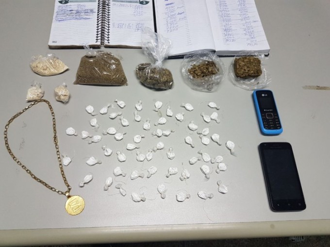 Foram apreendidas 58 trouxinhas de cocaína, 4 porções de maconha tipo Skunk, 3 porções de oxi e 2 cadernos de contabilidade das vendas de droga.