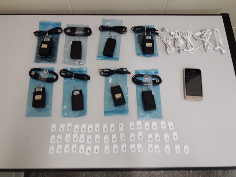 Segundo a SEAP, no interior das bolas foram identificados 08 carregadores de celular, 08 cabos USB, 05 fones de ouvido, 01 aparelho celular Samsung J1 e 49 chips Vivo 4G.