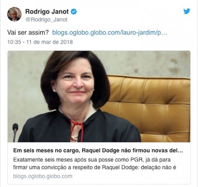 O ex-procurador-geral da República Rodrigo Janot questionou em sua conta no Twitter a atuação da sua sucessora e atual procuradora-geral da República, Raquel Dodge. Ao compartilhar uma nota publicada na coluna do jornalista Lauro Jardim, de O Globo, que afirma que, em seis meses de mandato, Raquel não fechou nenhuma nova delação premiada, o ex-procurador pergunta: "vai ser assim?"