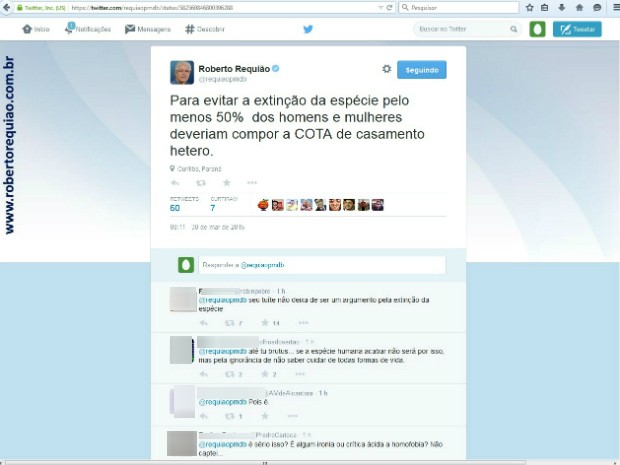 A mensagem foi publicada no Twitter e gerou uma avalanche de críticas ao senador. Alguns seguidores criticaram a opinião do senador e acusaram de homofobia. Em nota, a assessoria de Roberto Requião disse que a declaração foi irônica.