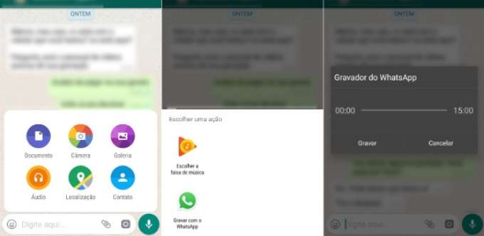 Para usar essa nova opção, você tem que clicar no ícone do clipe. Vão aparecer várias opções e um delas é “áudio”. Após clicar no símbolo do áudio vai aparecer mais duas opções “escolher a faixa de música” e “gravar com o WhatsApp”, escolha a segunda. Você pode gravar até 15 minutos sem interrupção, além de poder sair do aplicativo também, que a gravação continua normalmente em segundo plano.